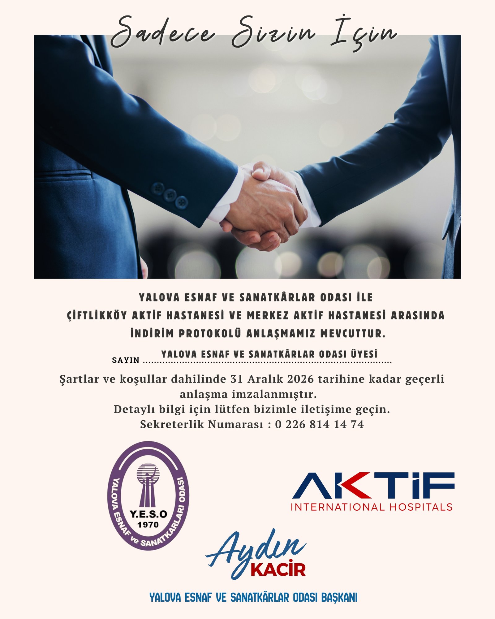 ÖZEL AKTİF INTERNATIONAL HOSPITAL ( AKTİF HASTANESİ) YALOVA ve Yalova Esnaf ve Sanatkarlar Odası arasında imzalanan indirim protokolü kapsamında, oda üyelerimiz ve 1. derece yakınlarına 30/12/2026 tarihine kadar (doğum, estetik,sünnet,diş, dermatoloji,psikiyatri,psikolog,diyetisyen,onkoloji,romatoloji,göz,estetik ve plastik cerrahi, nöroloji ve iç hastalıkları indirima dahil değildir) muayene ve tetkik tedavi hizmetleri için %30 indirim avantajı sağlanmıştır.