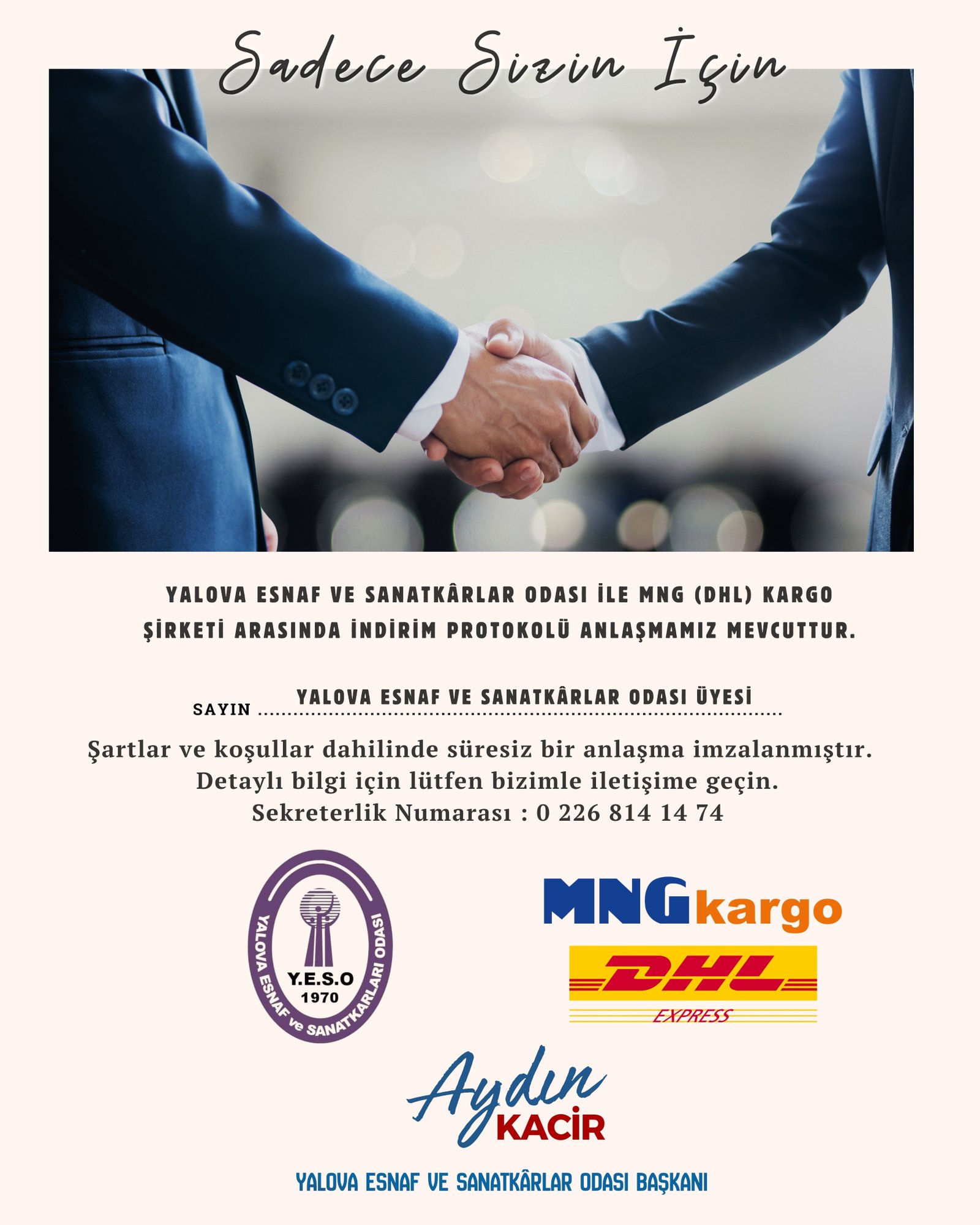 DHL (MNG) Kargo Yurtiçi ve Yurt dışı Taşımacılık A.Ş. ile Yalova Esnaf Ve Sanatkarlar Odası arasında, Yalova esnafımızın kargo taşımacılığının maliyetlerinin düşürülmesi amacı ile DHL(MNG) Kargo tarafından Yalova Esnaf ve Sanatkarlar Odasına kayıtlı esnaf ve sanatkarlar ile kargo gönderimi sağlayacak esnafımıza 01.01.2026 - 31.12.2026 tarihleri arasında %60 indirim kuponu uygulaması düzenlenmiştir.